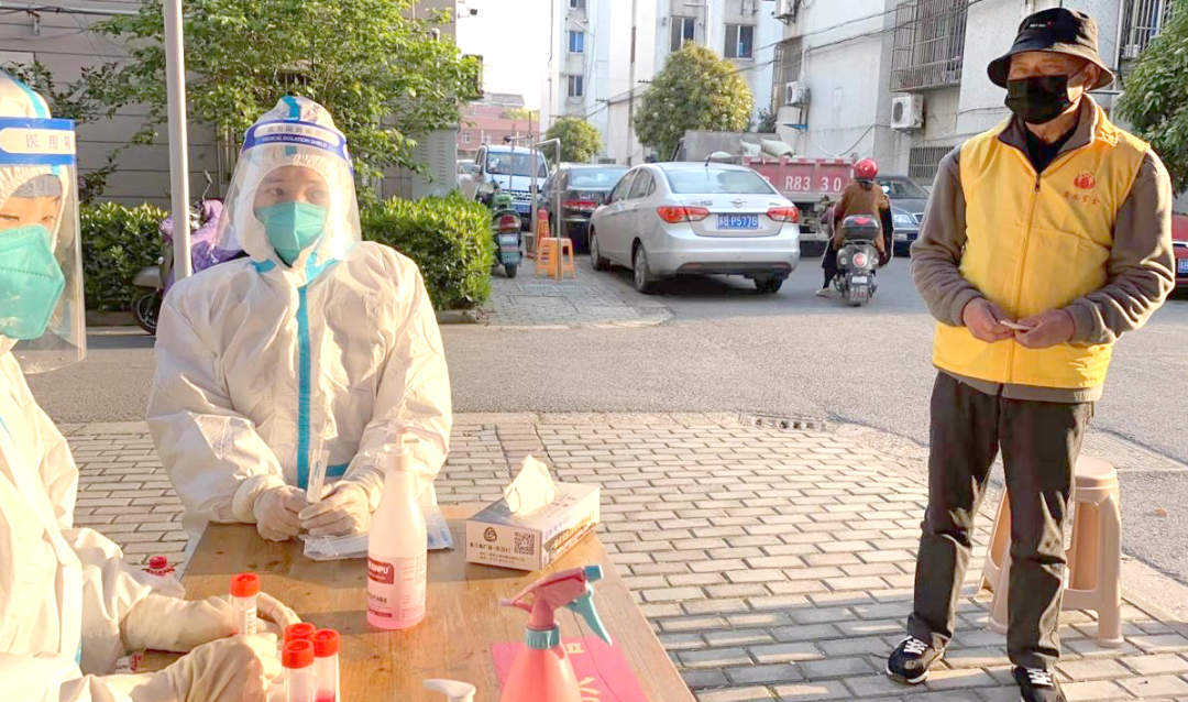 在江阴市南闸街道谢南村,爷爷居文兴在点位负责消杀、引导,他的“小搭档”孙媳妇苏慧君负责扫码录入信息,两人一天连续工作7个小时,全力奋战在抗疫一线。