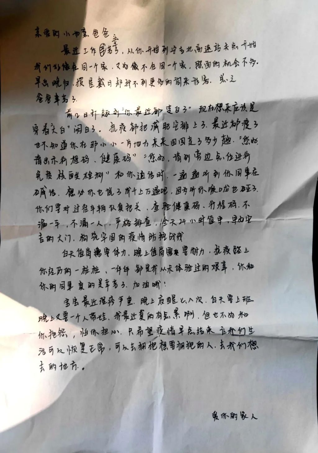 奔波在抗疫一线,家人之间见面次数少了。一封书信、一张绘画,承载着千言万语,送到抗疫一线人员的心坎。队员赵泉在安吉北高速口工作多日,他的妻子在信中说:“只能在你空闲之余和你视频,看看你工作时的模样,看你脸上的口罩印痕,会觉得心疼,注意安全……你放心,我会好好照顾爸妈和儿子,让你无后顾之忧。”队员郭淼的女儿十分想念父亲,她在信中说:“我会好好读书,听妈妈的话。”队员汪昊翔的姐姐为他感到骄傲,并鼓励他,“一切都会好起来的,加油弟弟!”
