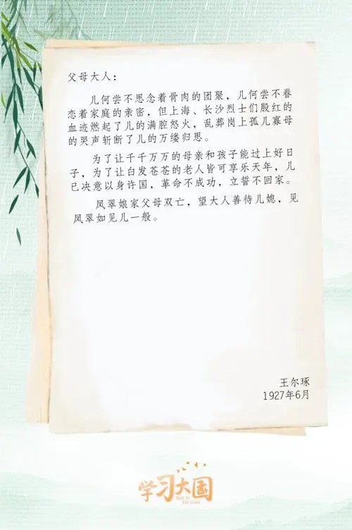 1927年,王尔琢任国民革命军第4军25师74团参谋长。北伐军攻克武昌后,他写信让妻子郑凤翠和未曾谋面的三岁女儿前来团聚,但“四·一二”反革命政变的发生,王尔琢因被通缉未能与妻女见面。他感到非常愧疚,就提笔给父母写了这封信。