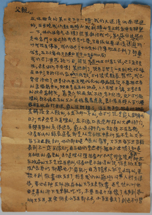 林晖在信中说,共产党来了,就是穷人翻身的日子。“不要拼(凭)过去的旧脑筋……现在是民主的政府。”在信中,他嘱咐父亲,遇到事情去找共产党解决,“共产党领导的政府,是解放全人类的,不是为那(哪)一个的。”