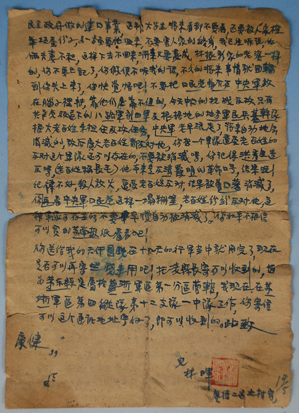 “你快觉悟吧!不要把国民党、蒋介石、中央军放在脑子里转,靠他们是靠不住的。今天中国的抗战反攻,只有共产党领导下的八路军、新四军及根据地的地方军、民兵基干队、扩(广)大老百姓来担任反攻任务……”这是一名坚定的共产主义者的家书。